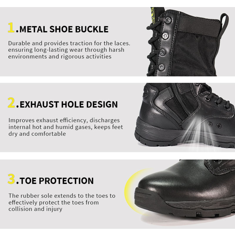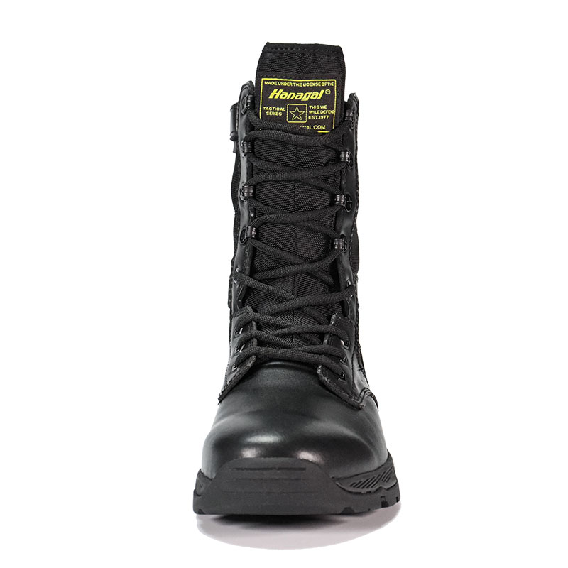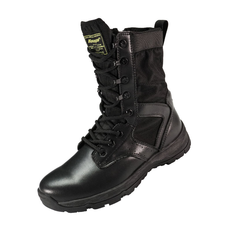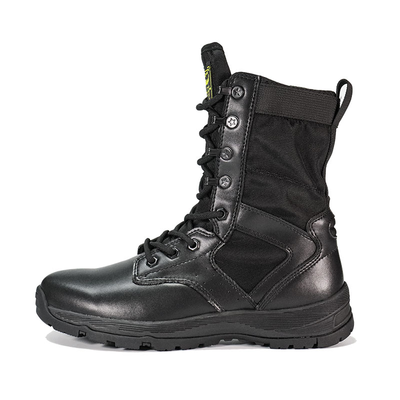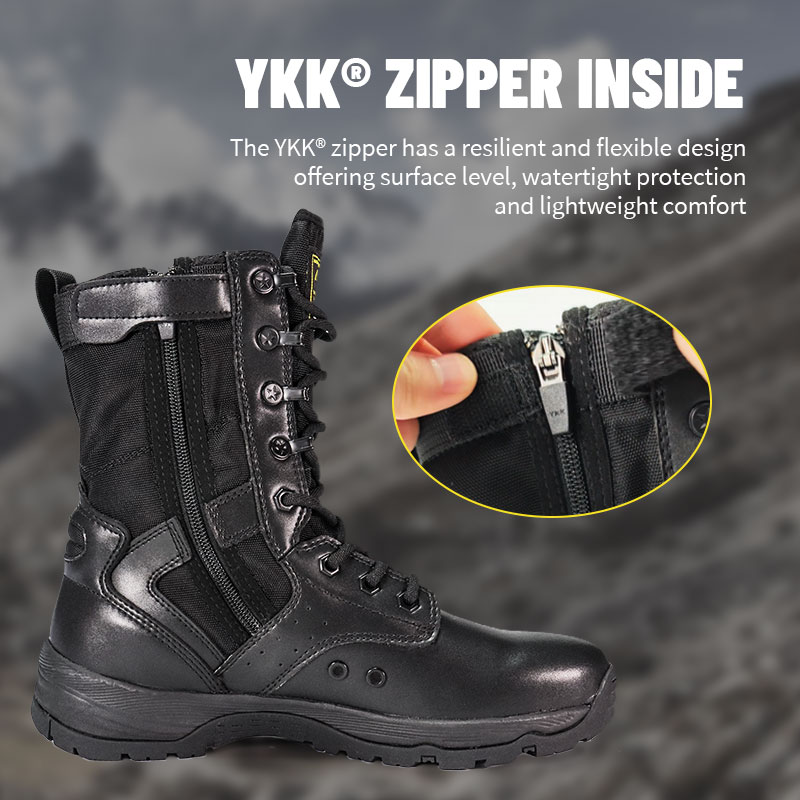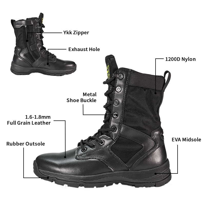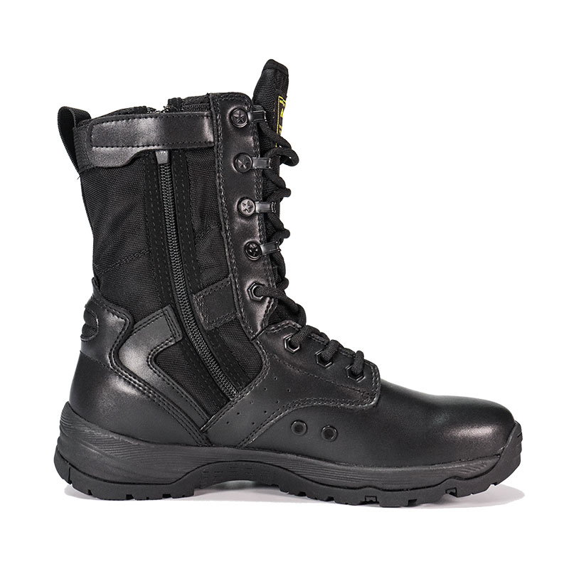 ராணுவ வீரர்கள் மற்றும் வெளிப்புற ஆர்வலர்களுக்காக கட்டப்பட்ட, முழு ரப்பர் அவுட்சோல் போலீஸ் பூட்ஸ், கடினமான நிலப்பரப்பில் தீவிர நிலைப்புத்தன்மையுடன் ஒரு வசதியான, போர்த்திக் கொண்டு பொருந்தும். ஒரு gusseted நாக்கு குப்பைகள் வெளியே வைத்து மற்றும் மையமாக இருக்கும், நீடித்த மெல்லிய தோல் மற்றும் நைலான் மேல் கடினமான சூழ்நிலையில் நிற்கும் போது. YKK ஜிப்பர் ஆன்-ஆஃப்-ஐ எளிதாக்குகிறது - எனவே நீங்கள் முன்னோக்கிய பணியில் கவனம் செலுத்தலாம்.