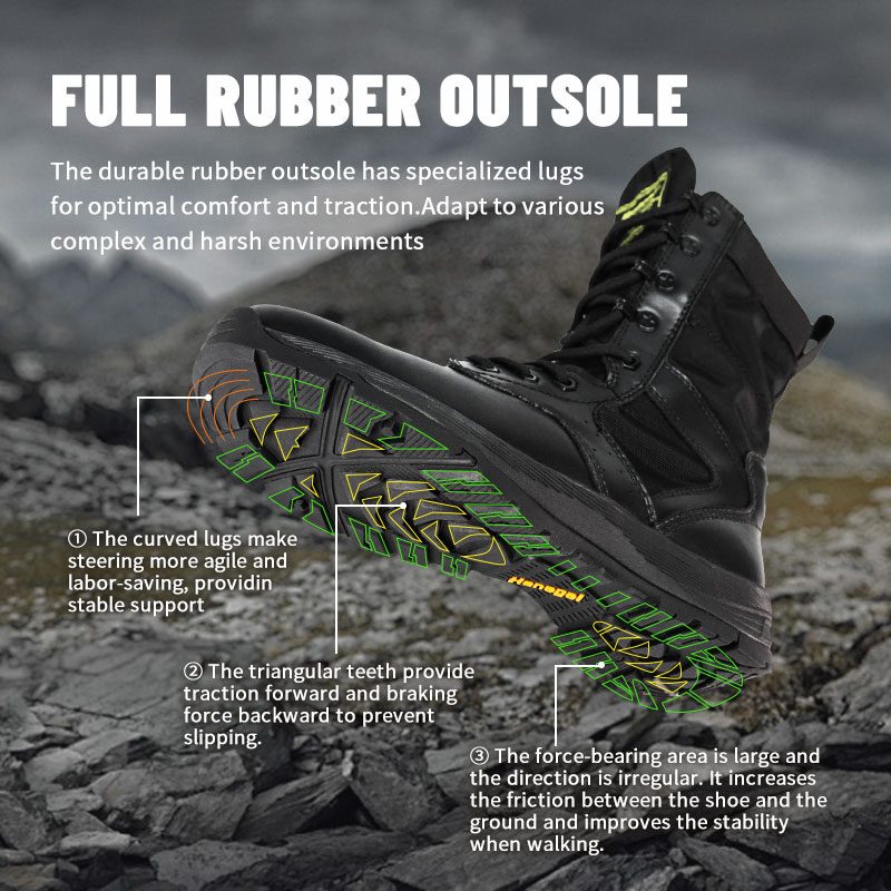 நீடித்த ரப்பர் அவுட்சோலில் உகந்த வசதி மற்றும் இழுவைக்கான சிறப்பு லக் உள்ளது. பல்வேறு சிக்கலான மற்றும் கடுமையான சூழல்களுக்கு ஏற்ப