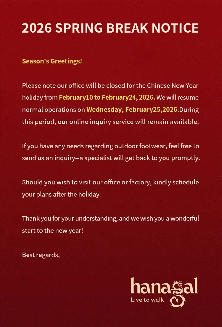 சீனப் புத்தாண்டு நெருங்கி வரும் நிலையில்,ஹானகல்சீனாவில் 23 வருட அனுபவமுள்ள உங்களின் நம்பகமான வெளிப்புற காலணி பங்குதாரர் விடுமுறைக்கு எங்கள் கதவுகளை மூடுவார்பிப்ரவரி 10 முதல் 24, 2026 வரை. குழு புதன்கிழமை மீண்டும் பணிக்குத் திரும்பும்.பிப்ரவரி 25.